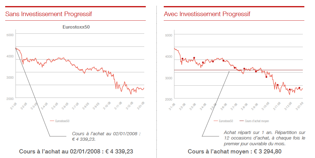 Investir n'est malheureusement une science exacte pour personne : le rendement que donne cet exemple en optant pour l'investissement progressif ne constitue donc pas une garantie pour l'avenir.